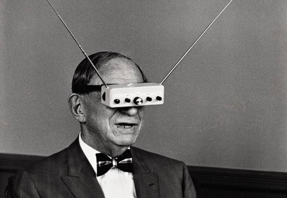 Hugo Gernsback demonstrating his TV goggles in 1963